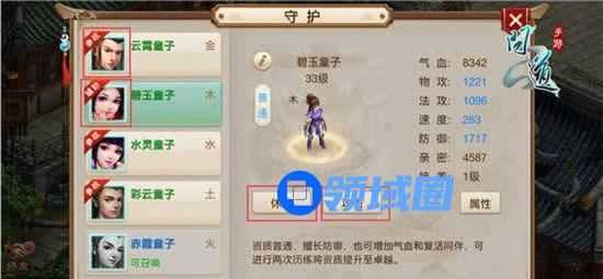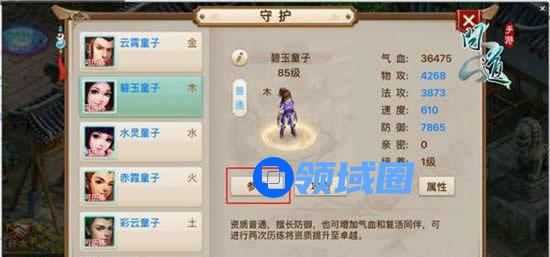 如上图所示,当守护上场参战后,其实还有两个状态:参战和辅助。“参战”状态下的守护全力攻击,“辅助”状态下的守护以辅助技能为主。以此图为例,道友点击 图中“攻击”按键可将碧玉童子从辅助状态变为参战状态。另外,守护是可替换的,换守护的话,需要先让守护休息,再让守护参战。