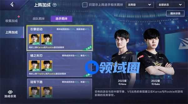 选手羁绊就简单多了,一般为指定的两名或三名选手同时上阵的话,可以增加羁绊成员的属性。比如V5的Karsa与Rookie一同上阵可以激活“引擎启动”。再比如Rookie与TheShy一同上阵可以激活“極之利刃”。也就是说,如果想要同时激活两种选手羁绊的话,只需要TheShy、Karsa与Rookie同时在队伍中。另外,比较有意思的是,因为这两个选手羁绊中,同时都有Rookie。所以,这三个人同时上场的话,Rookie的羁绊加成会更猛。因为官方目前赠送了许多福利,想要在“开荒期”获得3个SSR还是比较容易的,经理们可以尽量以选手羁绊来考虑搭配前期的阵容。