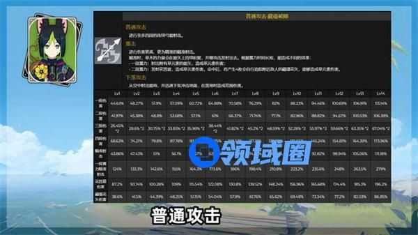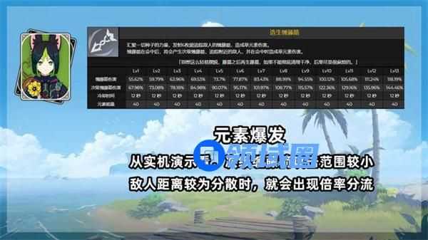 普通攻击4段5伤,9级总倍率382.36%。一段蓄力造成210.8%倍率的输出,二段蓄力命中后造成148.24%倍率的草元素伤害,会额外生成4枚追踪箭矢,造成65.62%*4倍率的伤害。