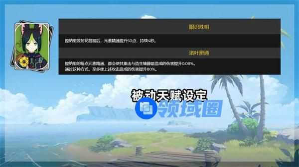 天赋1,提纳里二段蓄力后,4秒内元素精通提升50点;天赋2,提纳里每点元素精通会使蓄力攻击和大招伤害提升0.08%,最高提升80%。