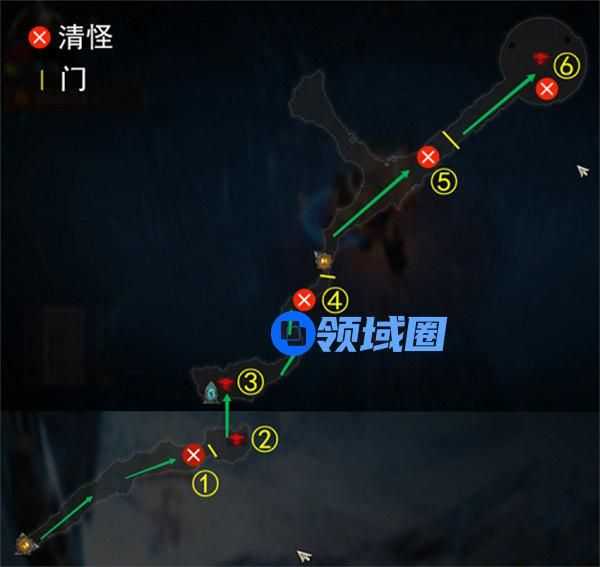 ① 清掉两只白熊 → ②打冰洞老一 → ③老一掀桌,继续打二阶段 → ④清掉小怪踢开冰柱 → ⑤清掉小怪打开大门 → ⑥清掉小怪,打冰洞老二,结束副本。