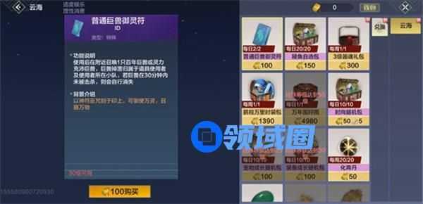 1、首先,玩家需要通过每日活跃度达到30并获得活跃礼包或在云海商城使用100遨游令拍兑换普通巨兽御灵符。