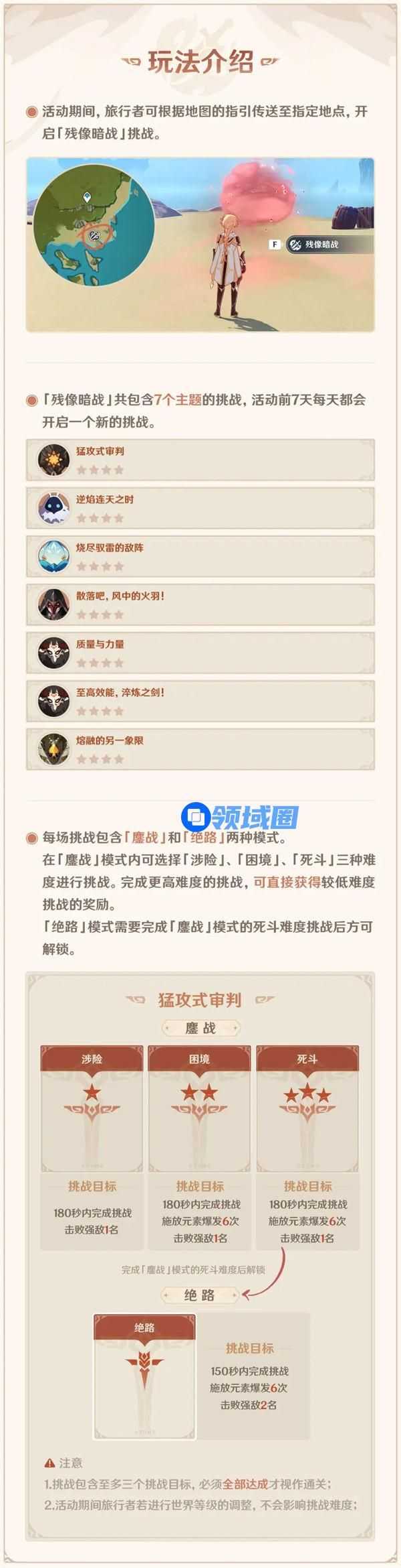原神是一款拥有高自由度的开放世界游戏,在提瓦特大陆上有许多个国家,能见到很多风格各异的游戏角色,穿着各自国家的特殊服饰。游戏中目前有着七个国家,分别对应七种元素,为火雷水冰风岩。来到这个世界的时候被一个神秘人阻扰,亲人失去下落,玩家将和小伙伴派蒙一起前往七个国家寻找自己的亲人。原神游戏画面超级细腻,有昼夜交替的游戏场景。可见微风在草地上吹,天气随着打雷下雨而变化,原神中的每个国家都有自己的特色场景,可以自由挑战副本关卡。接下来为大家介绍一下原神残像暗战玩法解析。