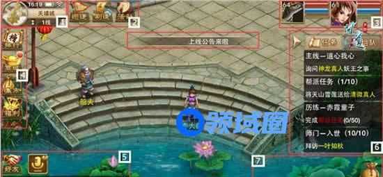 1、麻雀虽小,五脏俱全,标号1中内涵丰富啊!当前时间、网络环境、电量、地图和分线功能,应有尽有。玩家可以在此处查看当前时间和电量,还可以检查网络 环境,点开圆圈里图形状的地图可以查看大地图,而点击文字如“天墉城”字样,可以查看当前地图具体分布。这里还有重要的换线功能,玩家可以在此选择自己喜 欢的、不拥挤的分线。