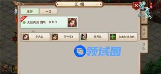 此界面会显示所有区组以及区组下所有角色,玩家可在同一区组建立不同角色,点击相应角色名称即可进入游戏。