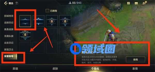 3.在个性化界面的左侧点击最后的“荣誉称号”,选择自己拥有的大乱斗称号,比如“乱斗卫士”,再点击右下角的“使用”,即可佩戴。如下图所示: