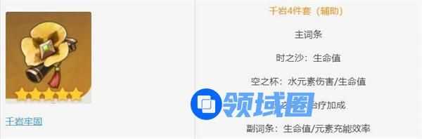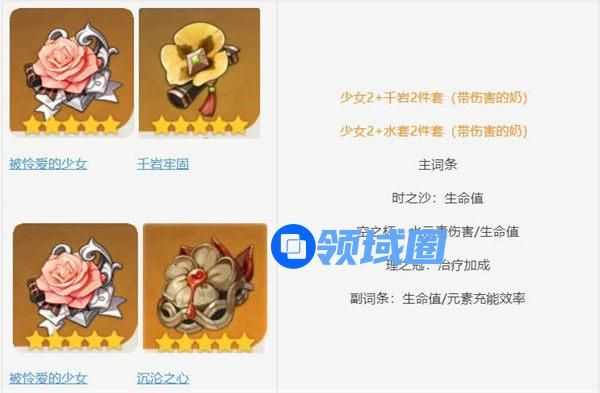 主词条时之沙生命值、空之杯水元素伤害/生命值、理之冠治疗加成。