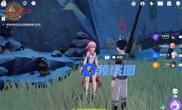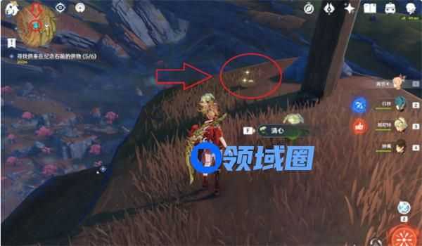 千年千岩任务接取是在巨渊之口传送点旁边,找到图中这个叫阿望的家伙,和他对话就能触发任务,让旅行者去6个不同的地方寻找6件供奉在纪念石前的供奉物品。这6件供奉物品分别是共饮之杯、岁时之冕、高翔之翎、远眺之花、庇佑之冠和同泽之枪,其实就是5件圣遗物和1件武器。在对话过程中,会有动画显示出这6件供奉物品所在的大致位置,我们按照位置去找就行了。