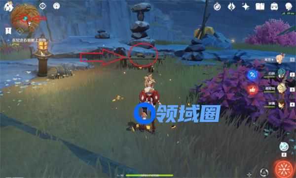 这件供物因为在地面,也是可以在跑图的过程中完成的,位于地面矿区右边的传送点附近。参照物是几块大型的岩元素共鸣镇石,如果实在找不到位置,就记住在传送点的左上方一段距离就行。供奉物就放在上图中的桌子上面,并且由一个盗宝团成员看守着,我们击败盗宝团成员之后,就可以调查桌子拿到岁时之冕。