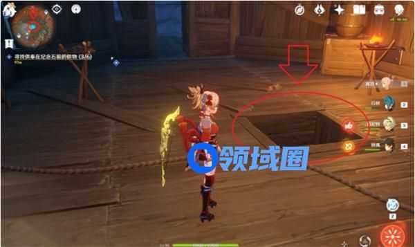 五、庇佑之冠传送到巨渊之口的传送点之后,朝下看可以看到一间很大的木头房子,进入房子之后到达最下面的一层。进入之后,会发现这里像一个小小的密室,地面有一堆干草垛,我们用火元素点燃草垛之后就会出现一个暗格,庇佑之冠就藏在这个暗格里面了。拾取供物之后,会有盗宝团成员想要夺取,打败他之后也可以接取另一个支线任务。