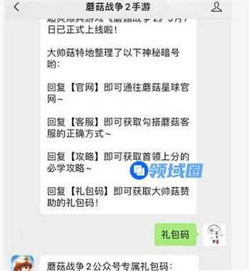 公众号图:(微信公众号搜索:蘑菇战争2手游,回复:礼包码。)