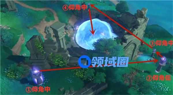 首先解释一下解谜思路: 击第一根发光的石柱,可以发射一道光束。 此处解谜需要调整所有石柱的角度,使第一道石柱发出的光東,可以经过所有石柱并从最后一根石柱中,射向水罩屏障就能解开。(PS: 后续解谜均是如此。)