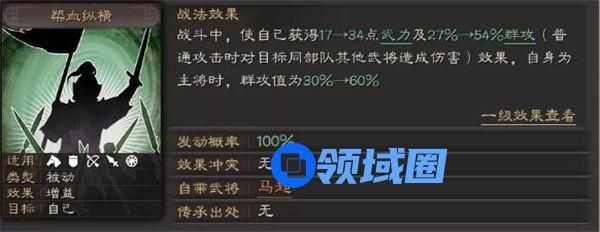 群攻效果:普通攻击对目标同部队的其他武将造成伤害(简称:溅射)。普及一下,以普攻伤害是100%计算,那群攻的伤害是根据普攻目标所受的伤害进行的溅射。即主目标打多少,那敌军的另两个队友就会受到马超普攻目标的伤害 * 54%,这就是群攻打出来的伤害数值。