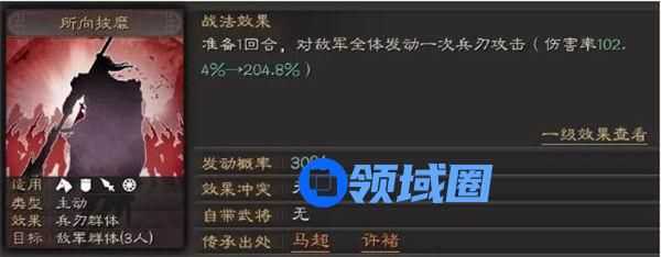 仅普攻就能提供稳定的群体输出能力。搭配强化普攻的战法,以及辅助武将,可以进一步放大马超的输出能力。但由于其惧怕缴械效果,如果让马超获得优越的输出条件 ,是玩好马超的首先要面对的问题。