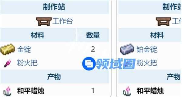 制作和平蜡烛需要一个粉火把和两个金锭或铂金锭,这意味着玩家至少要干掉一个粉色史莱姆