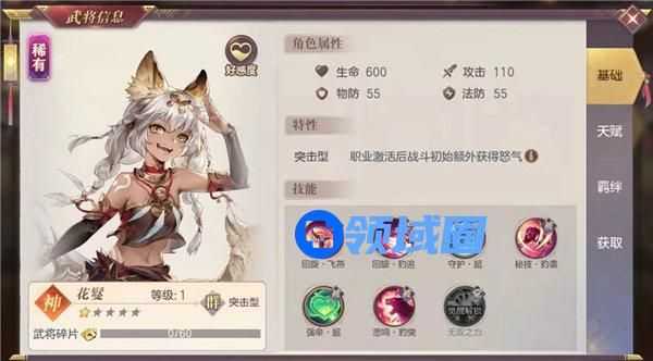 花鬘是一名突击型武将,初始品质为神将。是孟获和祝融的女儿。