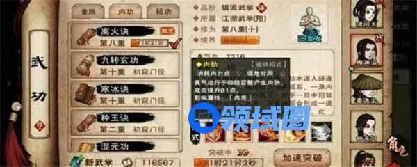 1、烟雨江湖中离火诀是比较易得的镇派内功,练到10重满时的面板属性是气血8200点、聚气10点,招式上除了提升气血和攻击外,第三个招式(6重)概率给对手上灼烧debuff,减5%气血和15%内力,第五个招式(10重)受到攻击时有15%的反伤。