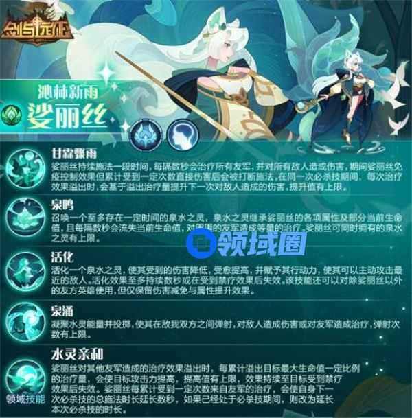 召唤一个至多存在一定时间的泉水之灵,泉水之灵继承娑丽丝的各项属性及部分当前生命值,且每隔数秒会流失当前生命值,对周围的友军造成等量的治疗。娑丽丝可同时拥有的泉水之灵有上限。
