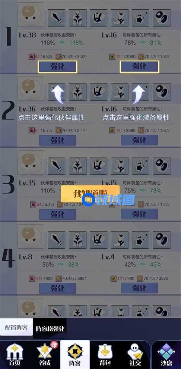 通关2-10后去“阵容”里升级伙伴“阵容格”,格子内可以给上阵伙伴进行全方位属性加成,伙伴可以随时更换,而加成永远都在。