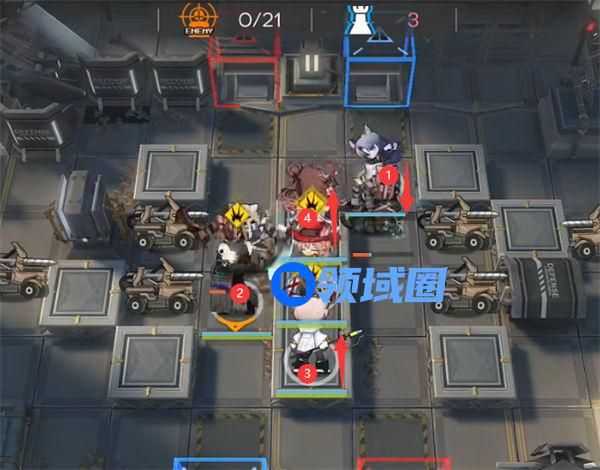 如下图所示位置部署先锋(向下)→ 奶盾 → 单奶(向上)→ 艾雅法拉(向上)