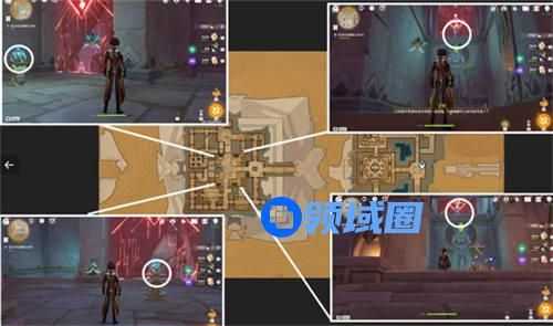 4:跟着指引,寻找笨笨,路线如图所示,前往愚人众营地寻找线索,再次深入遗迹,来到上面一层的遗迹这里,完成对应的解密,开启右侧的大门;