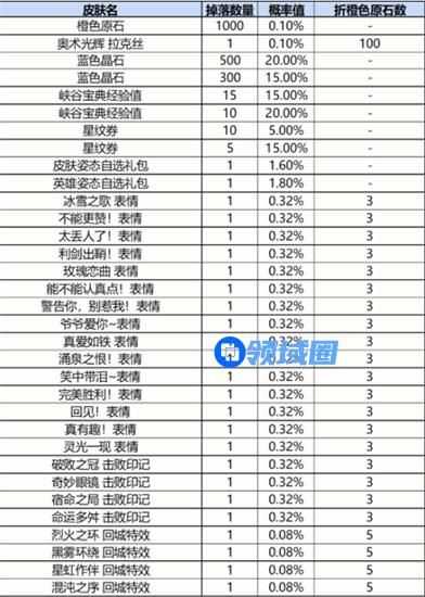 2.随机奖励概率:每次开启战利品宝箱,将随机获得一个奖励,奖励可重复获取。部分奖励重复获取后,将自动分解为橙色原石。