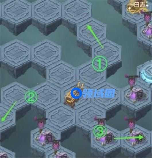 3、破碎之墟副本需要挑战两次才能拿到所有奖励,第一次按照下图所示的①、②、③的方向去挑战敌人,并记得要踩一下通道内的绿色机关。