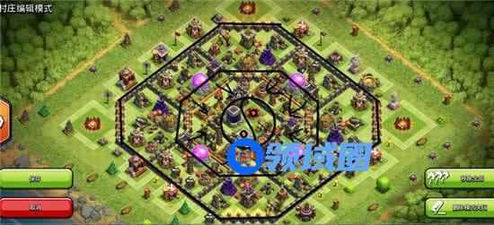 3、看我中圈的八边形,阵型的最佳设计。看图箭头部分,当进攻部队打进核心是,它就会被我的箭塔和加农炮所包围,主要