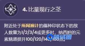 附近处于所闻遍计的蕴种印状态下的敌人数量为1/2/3/4或更多时,纳西妲的元素精通提升100/120/140/160点。