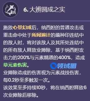 施放心景幻成后,纳西妲的普通攻击或重击命中处于所闻遍计的蕴种印连结中的敌人时,将对该敌人及其所处连结中的所有敌人释放业障除,基于纳西妲攻击力的200%与元素精通的400%,造成草元素伤害。