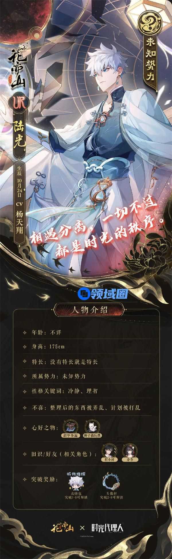花亦山心之月拥有精美的游戏画风设计,每个人物的画风都很让人喜欢,各有各的特点,能看到在画风这方面确实做的很好。在故事剧情方面人物性格的塑造也不错,剧情中穿插各种互动选项的玩法,在目前市场内挺新颖的,每个角色都有着自己的个性特点。其中的玩法多样,非常适合大家用于打发时间。游戏中陆光是来自另一个世界的青年,这名角色对摄影之术颇有研究,有着不错的辅助能力,可让队友随时恢复到最佳状态,他也是游戏与时光倒流人进行联动后上线的限定角色,接下来为大家介绍一下花亦山心之月陆光技能强度分析一览。