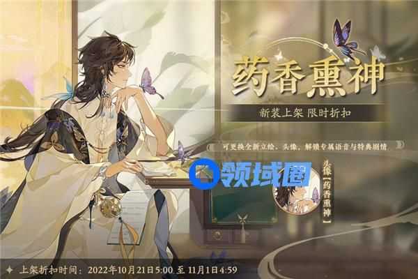 活动说明:惊墨新装-【药香熏神】上架,限时可以折扣价格购买,购买后可为名士穿戴新装,更换全新立绘、头像,解锁专属语音与特典剧情。折扣期间新装售价为68元,限时折扣结束后将恢复至98元。