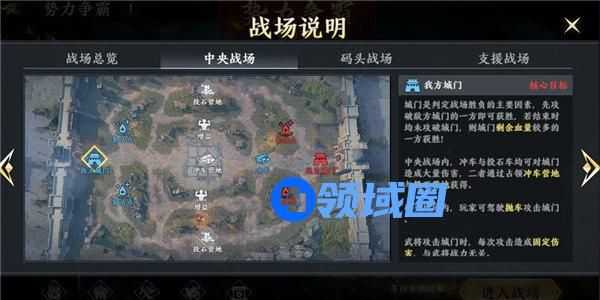 中央战场:是最比拼人数和战力的战场,有三块争夺区域,能直接对城门造成伤害,是城伤占比最高的战场。要知道,城门的血量是获胜的评判标准,城门血量先归0的一方,则失败。