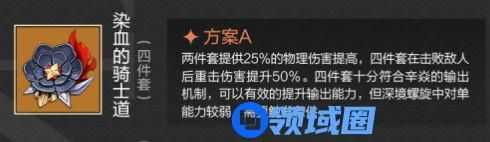 两件套提供25%的物理伤害提高,四件套在击败敌人后重击伤害提升50%。四件套十分符合辛焱的输出机制,可以有效的提升输出能力,但深境螺旋中对单能力较弱。需要触发条件。
