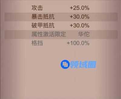 属性:攻击增加25%,暴击抵抗增加30%,破甲抵抗增加30%,安放在华佗身上之后激活限定属性,格挡增加100%,几乎直接可以无视对方伤害。