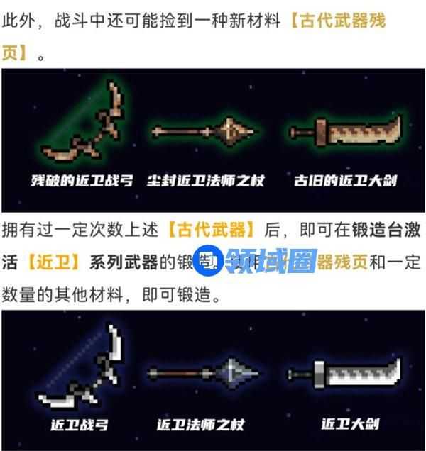 1、古代武器残页是新增的锻造材料,能够在战斗中概率获得,作用是锻造近卫列武器。