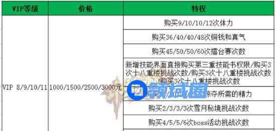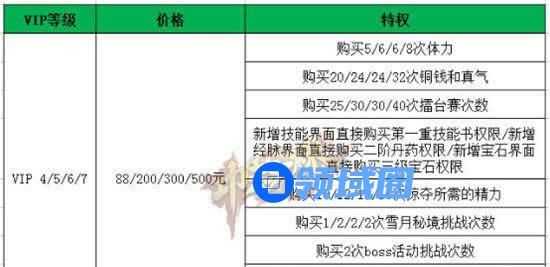 此阶段的VIP玩家,主要是可用来强化装备。除初级阶段的体力值、铜钱、真气购买外,可以直接购买到稀有技能书、经脉冲级丹药、三级宝石等高极材料。另外可以额外购买秘境挑战的次数、BOSS活动挑战的次数,同时享有9~12次不等的熔炼商店刷新机会。