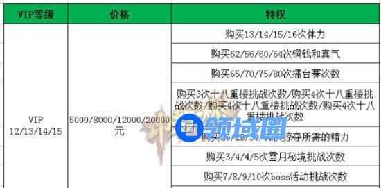此阶段的VIP玩家,已拥有顶极特权。主要是在进阶装备的基础上,再来获取称号。在VIP15级阶段,最高可以购买16次体力,64次铜钱和真气、4次十八重楼的挑战次数、5次雪月秘境、10次BOSS活动、20次熔炼商店刷新、5次重置任意难度副本资格。