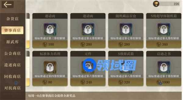 PS:赛程结算奖励均为源晶,不同赛程可解锁商店不同物品,邀请函、藏品、体力药剂、S级源武、S级超导体均可解锁,更有稀有道具启迪之书,额外增加进修点,满技能不是梦,一打五指日可待。