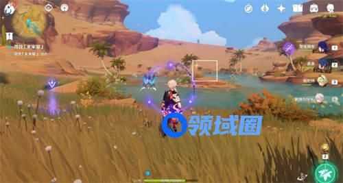 6、击败魔物后,游戏自动调整视角,在绿洲中心看到四叶印,利用四叶印飞过去。