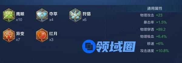 1、第一套铭文:3红月+7异变、6狩猎+4夺萃、10鹰眼