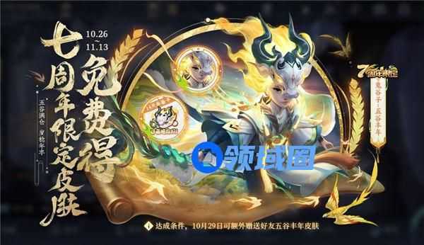 1、【五谷满仓】活动已开启,送七周年限定皮肤:鬼谷子-五谷丰年明日版本更新后,更多福利内容陆续开启: