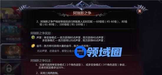 阿瑞斯之争是一个独特的PVP玩法。玩家可单变身模式(单一变身对战)或多变身模式(3个变身对战)参战。每天有3次机会参加阿瑞斯之争,胜利后将获得大量的金币和声望奖励,失败将一无所有,祈祷对手是个菜鸟吧!