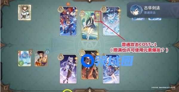 各卡牌左下/右上的数字目前还未确认具体作用,左上为卡牌血量,右侧菱形的含义目前暂时可理解为施放元素爆发需要的元素能量(下文暂且称为“元素能量”)。不同的卡牌施放元素爆发所需要的能量不同,并且还可能对敌方卡牌赋予元素效果。