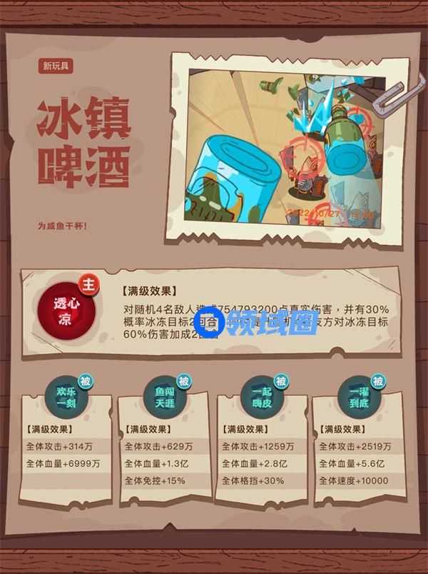 咸将塔是咸鱼之王之中最受玩家欢迎的玩法中之一,它为什么受欢迎呢,是因为玩家们对其的奖励特别感兴趣,就是招募令和进阶石,但这些奖励获取起来可不容易,在咸将塔玩法中充满了各种难缠武将,随着层数的增加越来越难,能让你感受到无力感游戏中冰镇啤酒是最新上线的玩具,其的作用在目前版本中看来,没有什么武将适合带上它作战,冰镇啤酒使用效果有着15%的免控和30%的格挡的加成,看起来挺不错的,可实际上作用不高,只能当个娱乐用的玩具,接下来为大家介绍一下咸鱼之王新玩具冰镇啤酒作用介绍。