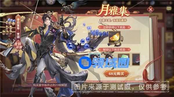 同时每月将有一款史诗级武将皮肤载入月雅集,68元付费解锁“月雅集豪华版”并达到20级即可获取,还有本期限定招募券、海量资源等你来领!