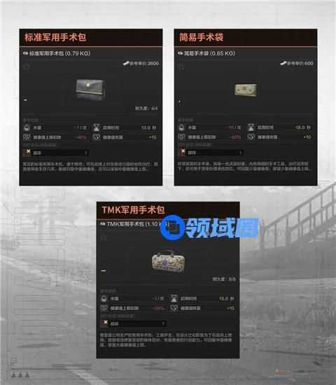 外围跑狙、跑喷、完成任务等战斗不太频繁的场合老皮推荐带1~2个简易手术袋即可;以一些非男团刷新点位的资源点为目标,很可能需要与游荡者或其他先锋战斗推荐携带1个标准军用手术包;以男团为目标或进入战斗频发的高级资源点如北山酒店、前线要塞内部等,尤其是与男团的战斗非常容易四肢被打黑,因此建议携带TMK军用手术包保证部位健康值上限同时兼顾使用频次。当然预算充足时STO套装更好用。