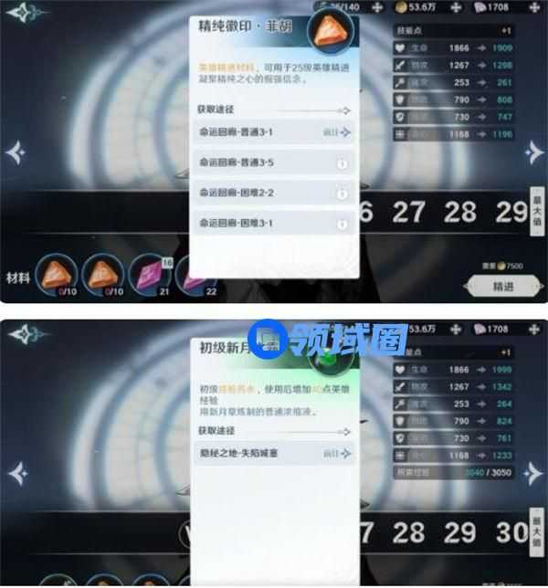 1、等级提升除了提升属性之外,每5级还需命运回廊产出的道具进行精进,精进之后,可以额外获得1个技能点,用于点选技能树。