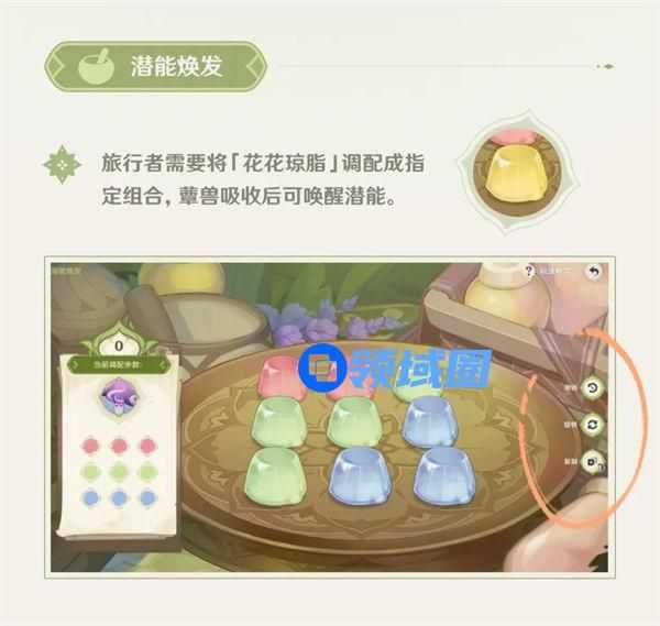 旅行者需要将「花花琼脂」调配成定组合,蕈兽吸收后可唤醒潜能。