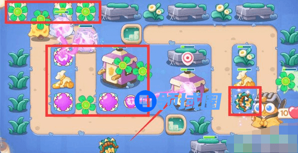 7、最后我们第十波把炮塔火力集中前半部分,最终地图布局如图所示。